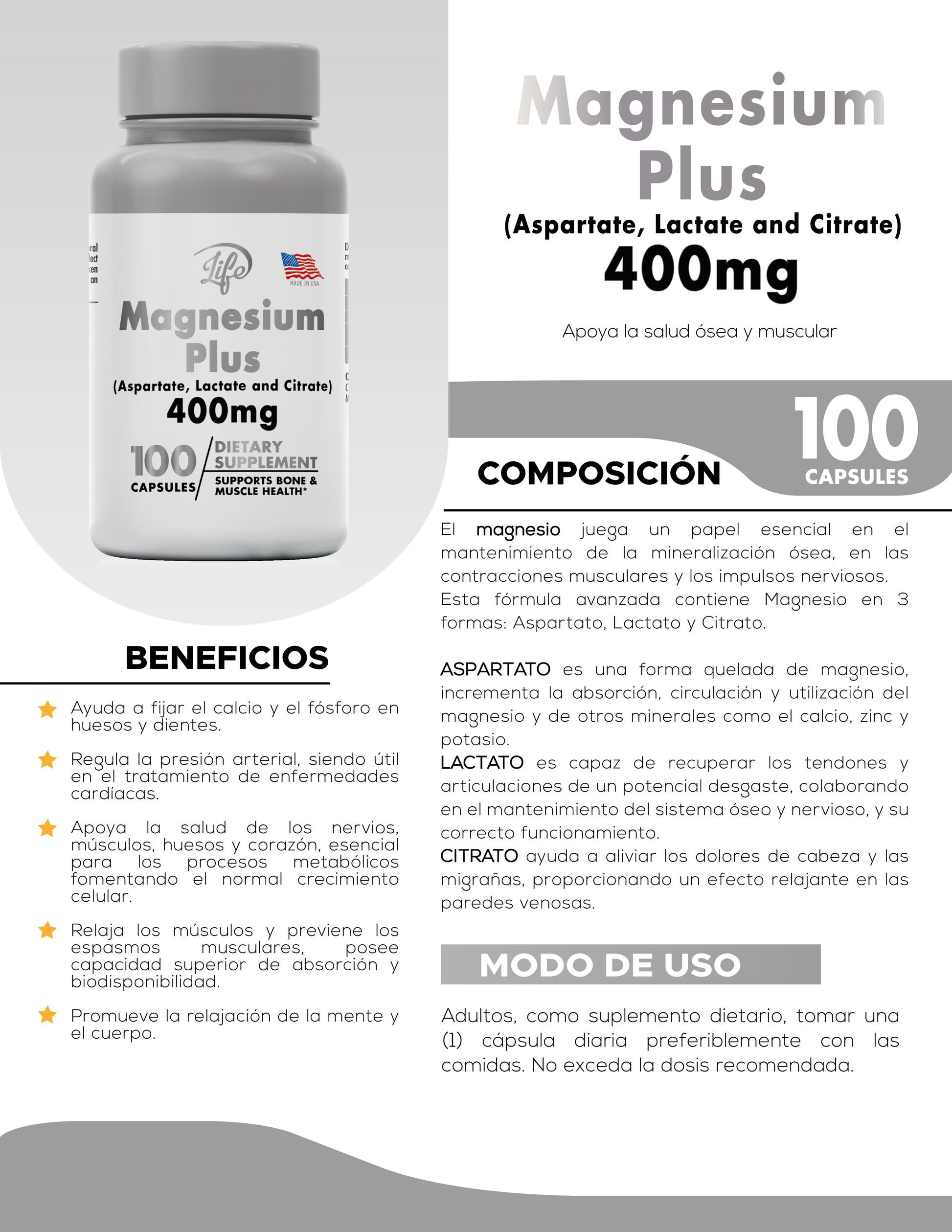 Este producto combina magnesio aspartato, lactato y citrato, formas altamente biodisponibles, lo que significa que el cuerpo lo absorbe mejor y lo aprovecha más rápido, con menos molestias digestivas.